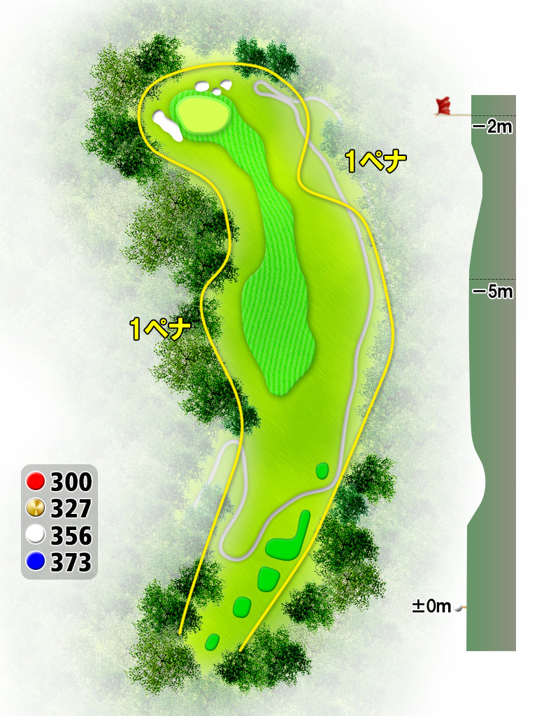 距離も短く、フラットなミドル。 第1打でフェアウェイ右にあるバンカーの右サイドをキープできれば、第2打が 打ちやすい。